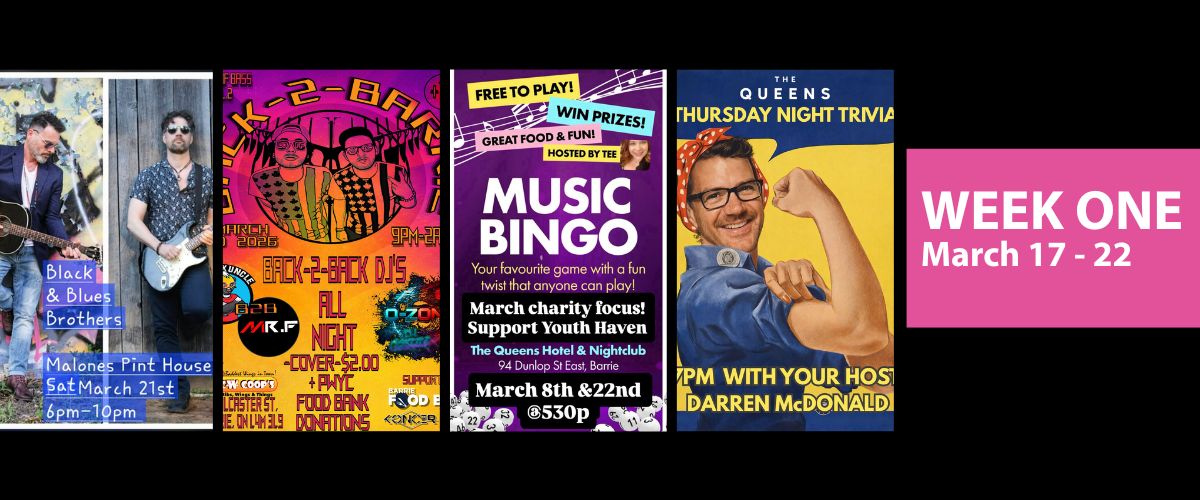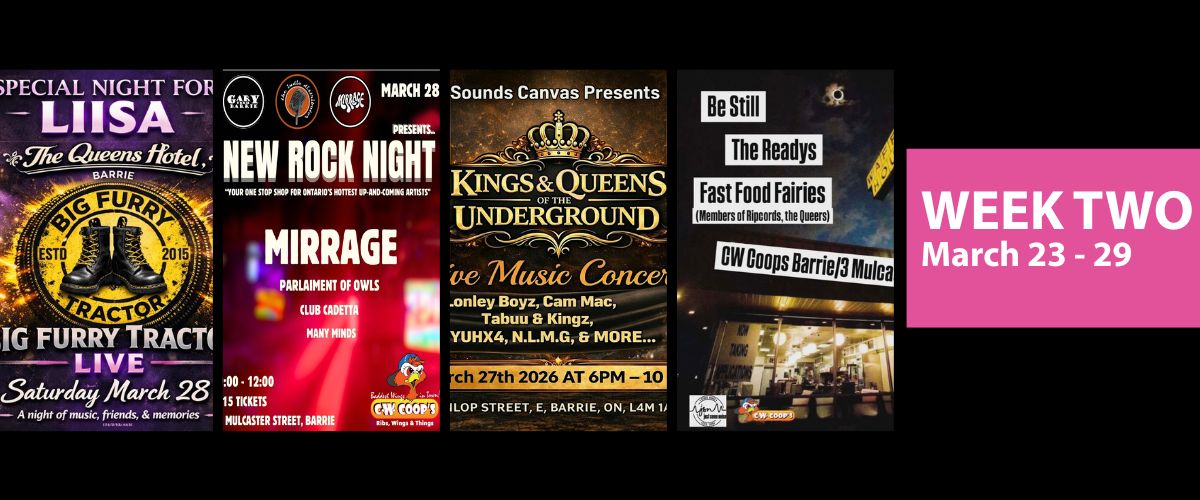 This list runs until Mar 29th – mark your calendars and make some memories. Whether you’re chasing shamrocks on Tuesday or riding the weekend wave, Simcoe County is green and glowing with raw, real Barrie talent. This bi-weekly guide, in partnership with Tourism Barrie and Local and Live 365, has you covered!
