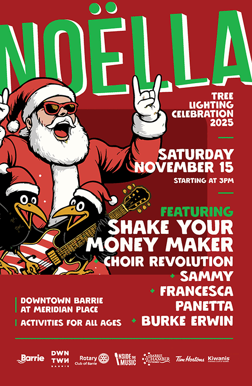 Saturday November 15th (3pm – 8pm) The Noella Tree Lighting Celebration is presented in collaboration with the Barrie Chamber of Commerce Santa Claus Parade, the Rotary Club of Barrie’s Festival of Trees, and the City of Barrie’s fireworks and event support. Together, these events create a weekend filled with community, creativity, and holiday magic in the heart of Downtown Barrie.