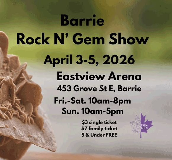 Witness the earth’s finest creations come to life at the Barrie Rock N’ Gem Show. Discover an exquisite collection of crystals that sparkle with brilliance, fossils that hold echoes of ancient worlds, and gemstones transformed into breathtaking works of art. Each piece is a testament to the power, beauty, and timeless artistry of the natural world.