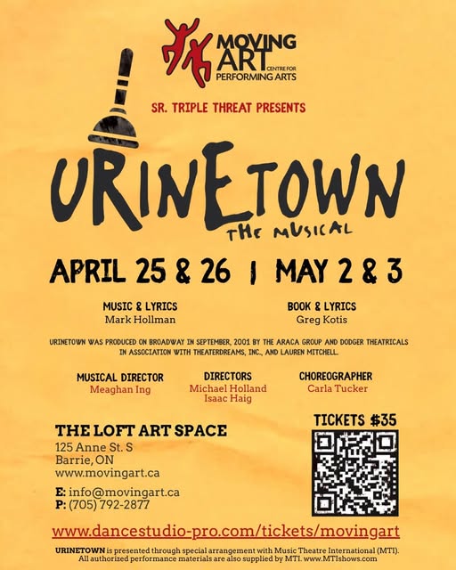 These dedicated performers bring impressive experience to the stage, with several having earned provincial and national recognition in music, and many travelling to Atlanta year after year, winning awards in music, dance, and acting. Urinetown is a sharp, satirical comedy that explores themes of power, politics, and society—delivered with humour, unforgettable music, and a message that feels especially relevant today.